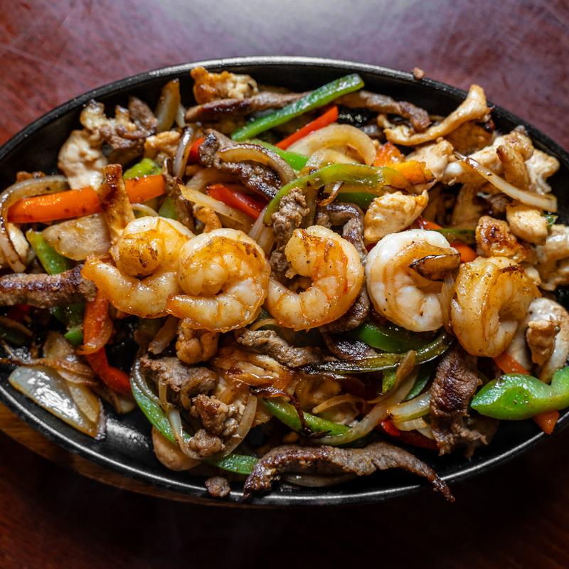 A hot stone bowl filled with ribeye chicken, shrimp, Mexican sausage,onion, jalapeño, grated cheese, tomatillo sauce, served with rice, beans with cheese, and tortillas.
