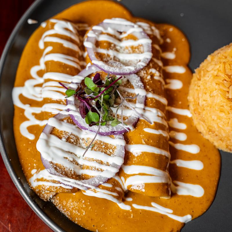Two shredded chicken enchiladas, adorned with creamy poblano sauce, queso fresco, sour cream, and onions. With a choice of rice or beans.